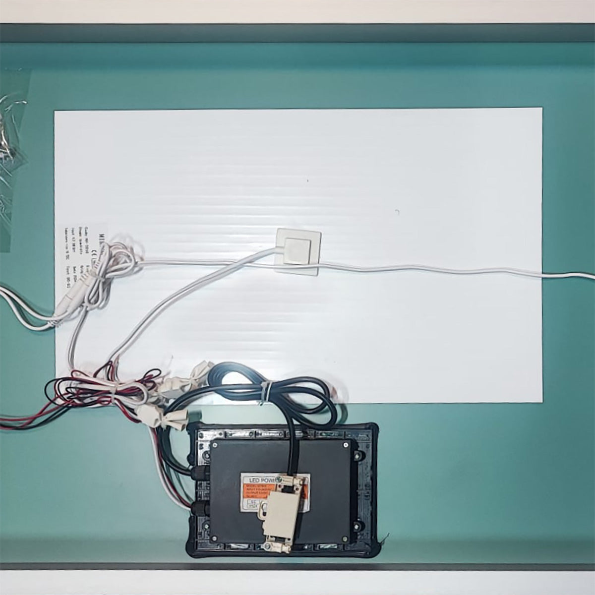 Spejlet leveres med et 90 cm langt elkabel. El-dåsens placering kan variere en smule, men den er altid centreret i spejlets underkant.