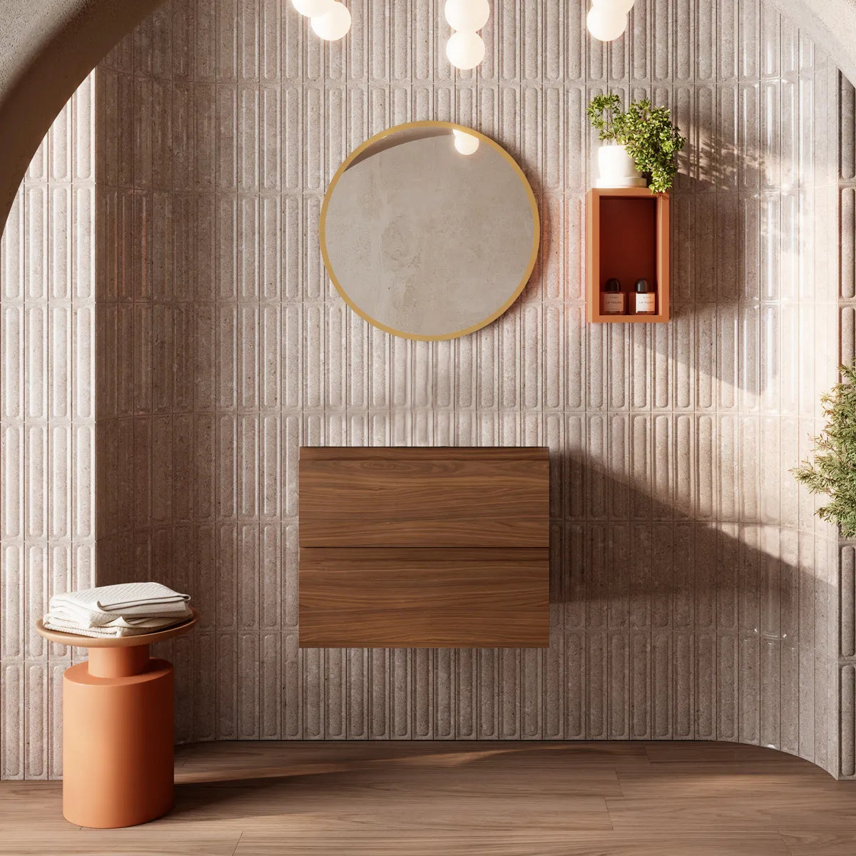 Tenfors Norrvik fås i flere udførelser: Eg, Valnød, Grå Fyr og hvid. Træimitationen er autentisk og giver en varm, naturlig følelse, mens den hvide variant tilbyder et minimalistisk og friskt udtryk. Overfladerne i lamineret MDF er holdbare og fugtresistente, hvilket gør dem særligt velegnede til badeværelsesmiljøer.