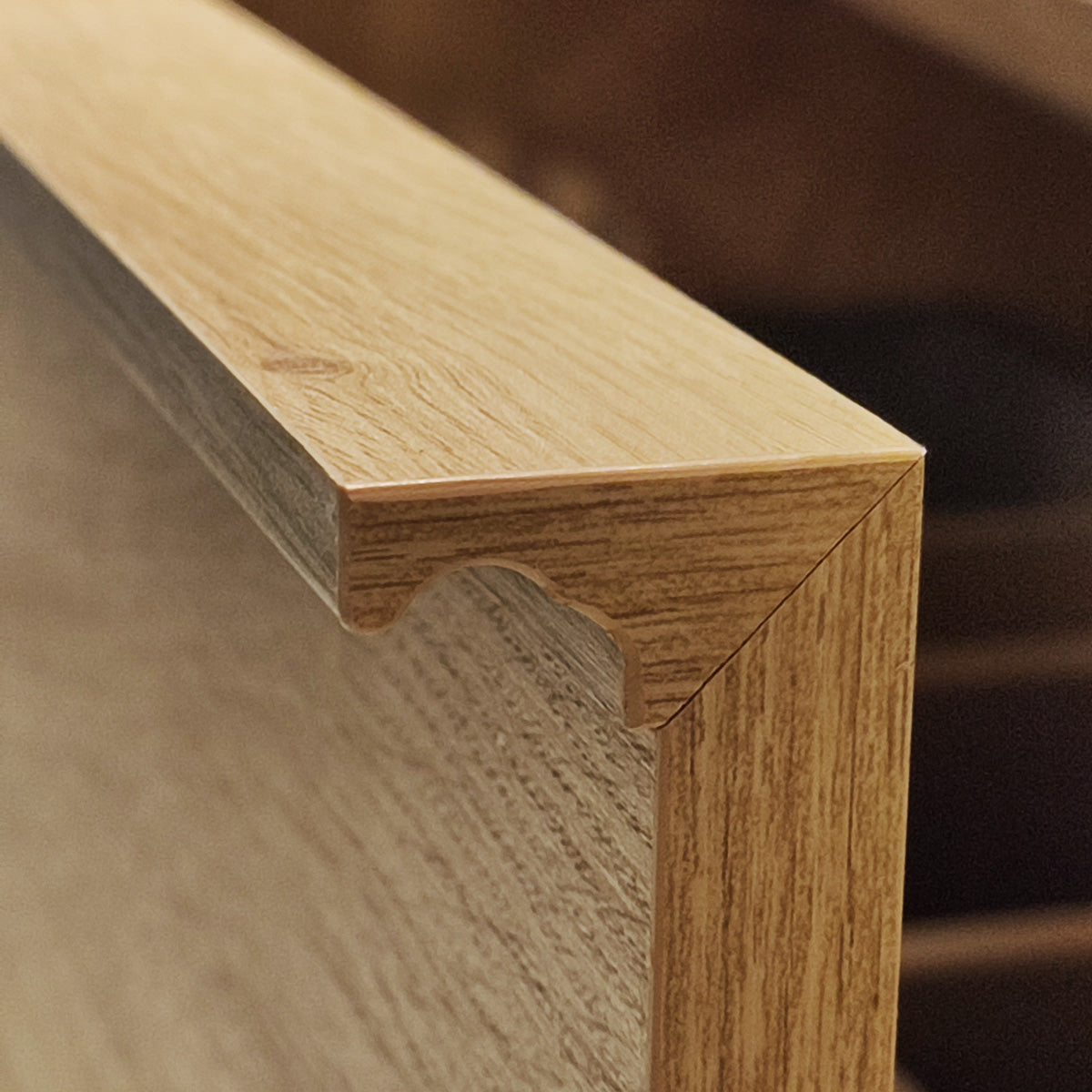 Grebskanten er integreret i skuffefronterne og fremstillet i samme laminerede MDF som resten af møblet – for en harmonisk og gennemtænkt helhed. Den matte overflade er både moderne og let at vedligeholde og giver et eksklusivt udtryk uanset farvevalg.