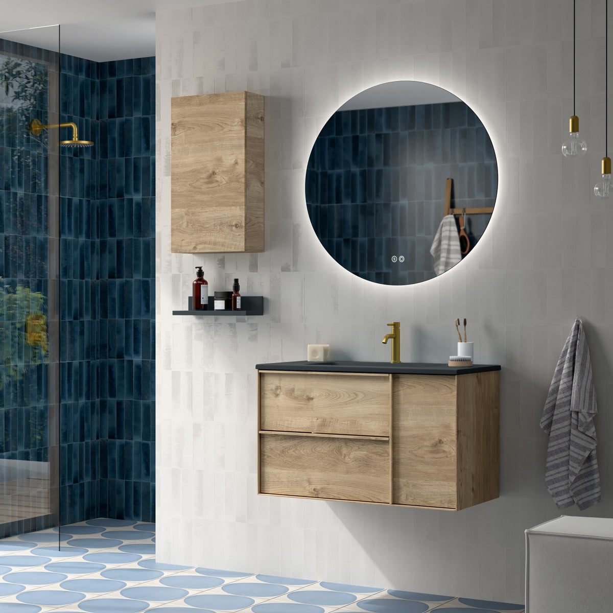 Kommoden fås i to bredder: 80 cm og 100 cm, med en dybde på 46 cm og en højde på 48 cm. Det kompakte, men rummelige design gør den velegnet selv i mindre badeværelser, uden at gå på kompromis med æstetik eller funktionalitet.