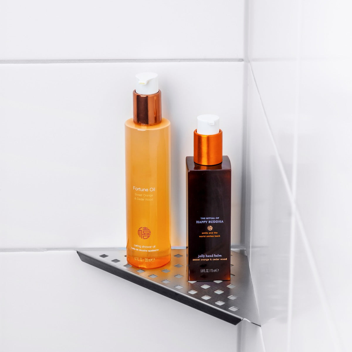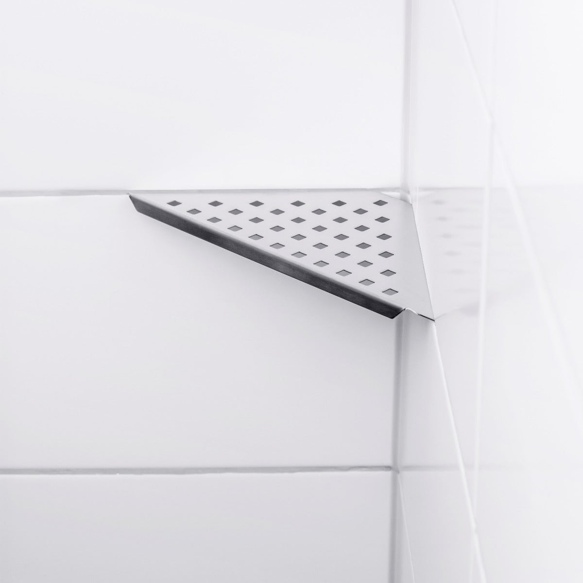 Brusehylde hjørne Stockholm er en elegant brusehylde af børstet rustfrit stål type AISI 304.