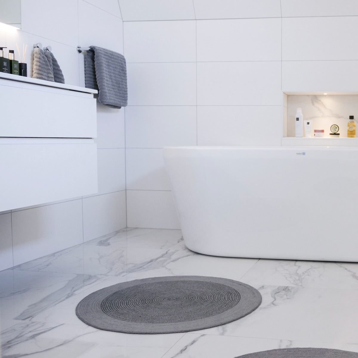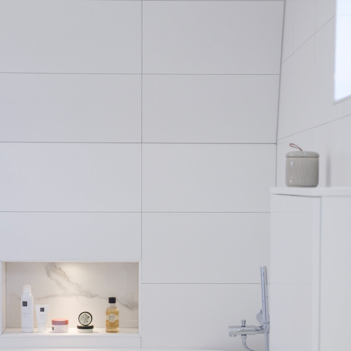 • Badeværelse: Med sin matte overflade og rene hvide farve skaber flisen en moderne og elegant følelse i badeværelset. Den er perfekt til at dække både vægge og bruseområder og fungerer godt med andre neutrale eller farverige indretningselementer.