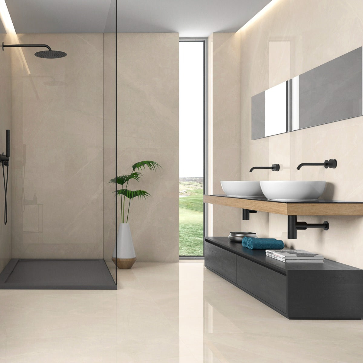 - Badeværelse: Den vandtætte og holdbare natur af granitkeramik gør Magda til et perfekt valg til badeværelser. De elegante marmormønstre skaber en luksuriøs spa-følelse, mens den mere skridsikre, matte overflade bidrager til sikkerheden.