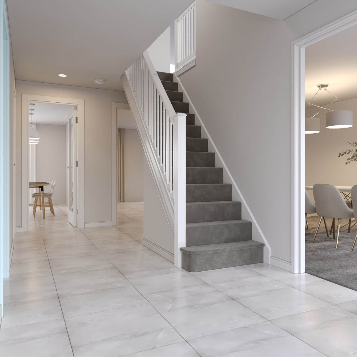 De subtile, men stadig distinkte marmoreringer skaber en visuel dynamik, der giver en følelse af luksus og stil. Den blanke overflade reflekterer lyset på en måde, der forstærker rumfornemmelsen og skaber en elegant atmosfære.