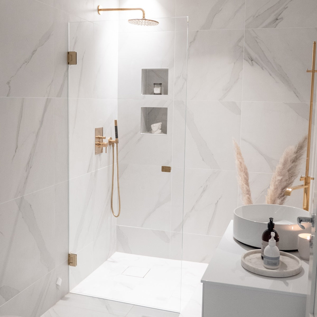 Bestil 1 m² fliser i mindre format (10x10 eller 15x15 cm) til bruseområdet. Det gør det muligt at etablere korrekt fald mod afløbet.